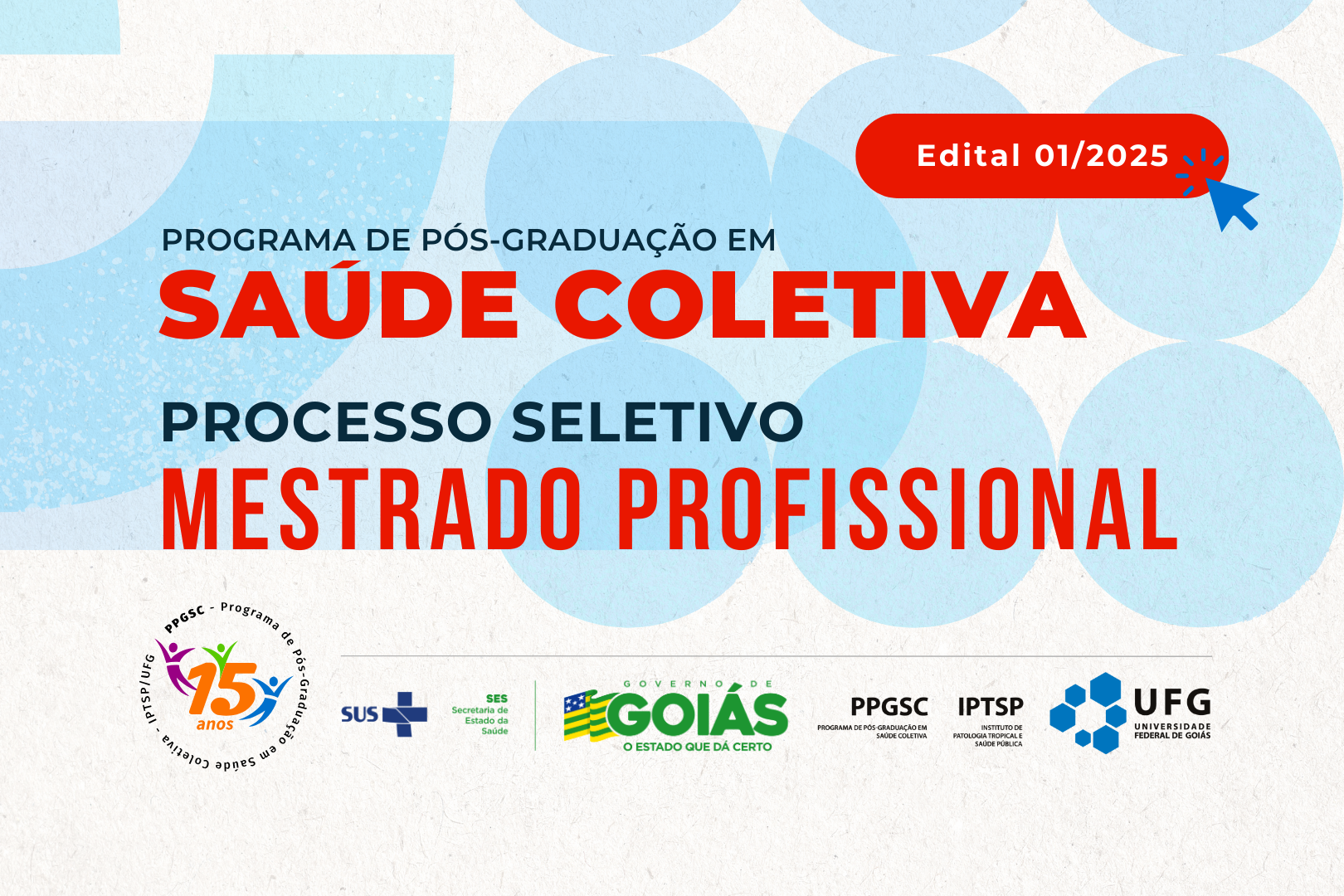 O Programa de Pós-Graduação em Saúde Coletiva (PPGSC), do Instituto de Patologia Tropical e Saúde Pública da Universidade Federal de Goiás (IPTSP/UFG), torna público o Edital nº 01/2025, que estabelece as normas do processo seletivo para ingresso no curso de Mestrado Profissional em Saúde Coletiva, com início das atividades no primeiro semestre letivo de 2026.